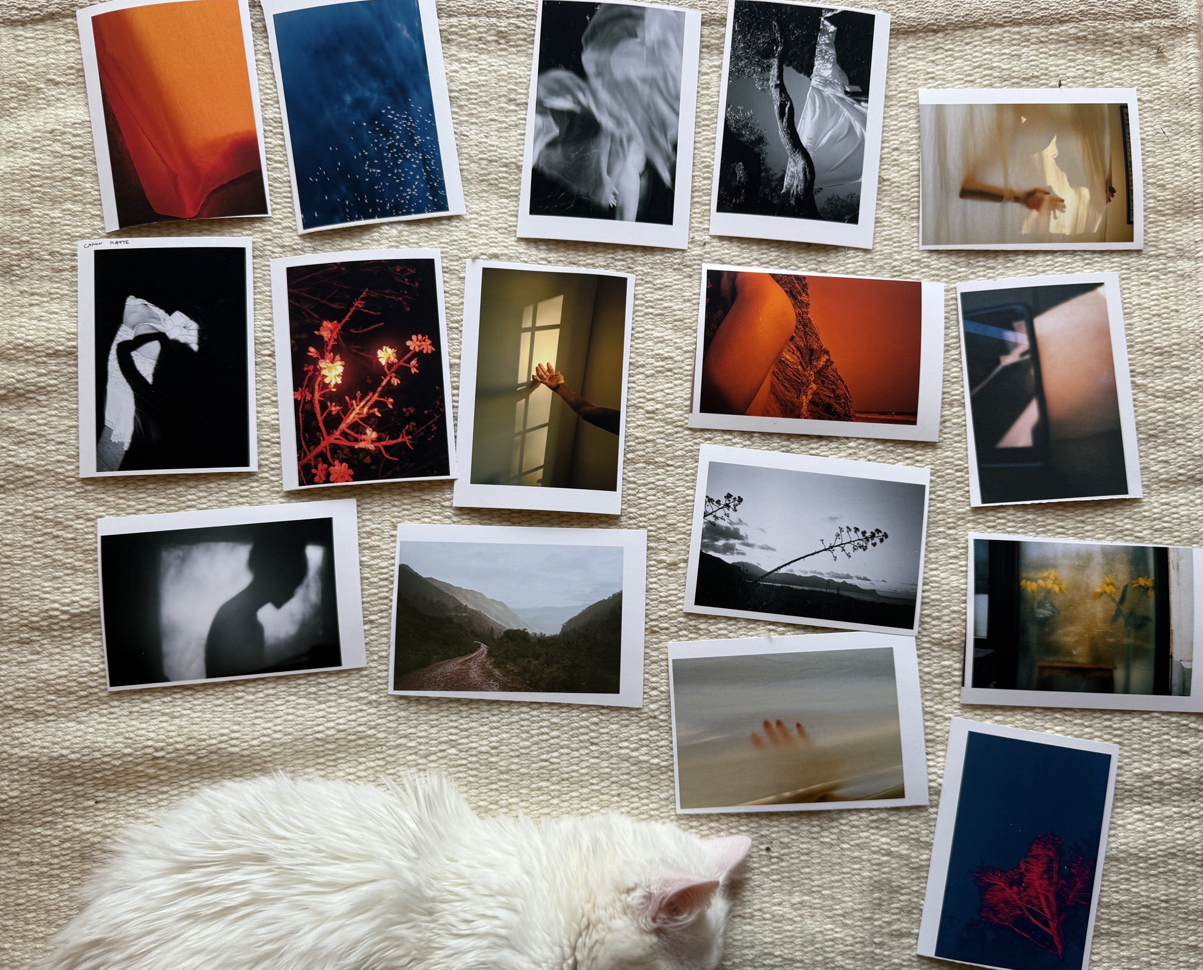 So I’ve been following that. Quietly, without announcement. Picking up the camera in the golden hour and photographing curtains, shadows on walls, my own hands reaching through light toward something I can’t quite name. I printed a few of the images. They’re sitting on the table right now.