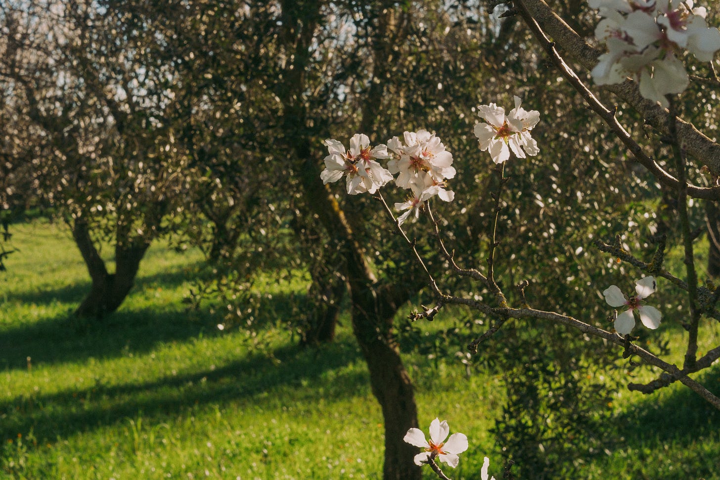 I thought initially these were cherry blossom trees, and apparently the flowering is eerily similar, although distinctive. Almond blossoms are usually white to pale pink with five petals, and you often see them on bare branches because they can open before leaves fully emerge.