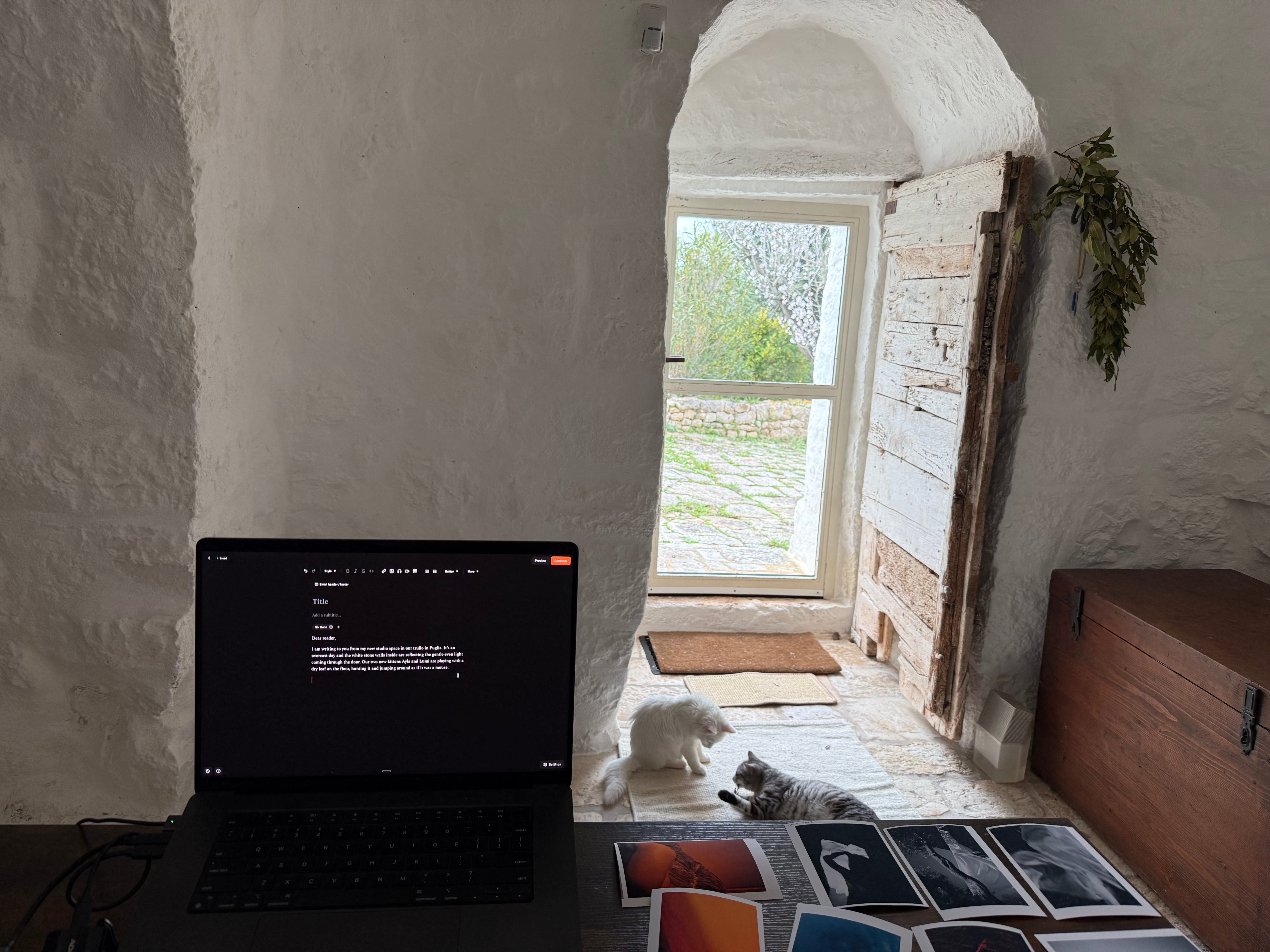 I am writing to you from our new studio space in our trullo home in Puglia. It’s an overcast day and the white stone walls inside are reflecting the gentle even light coming through the door. Our two new kittens Ayla and Lumi are playing with a dry leaf on the floor, hunting it and jumping around as if it was a mouse.